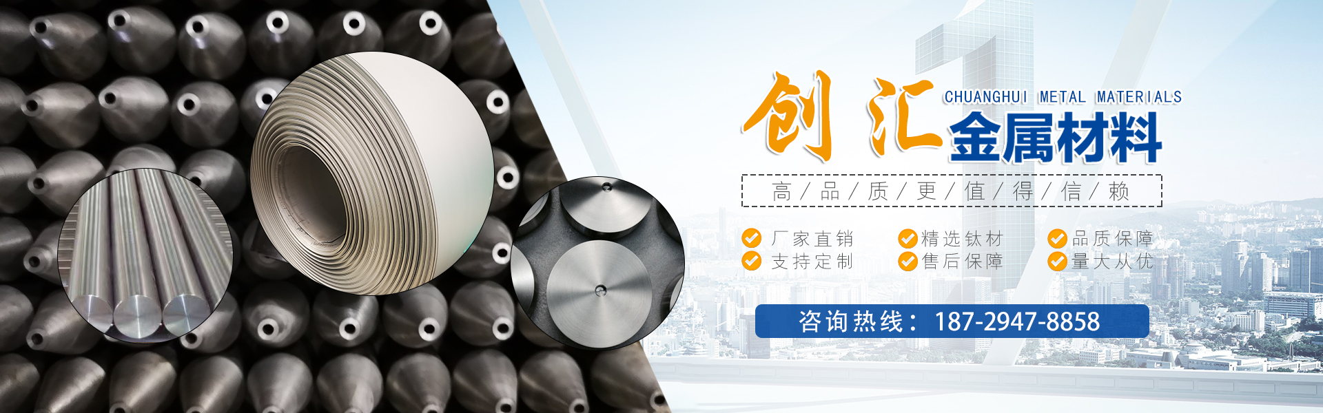 寶雞市創(chuàng)匯金屬材料有限公司,位于有“中國鈦谷”之稱寶雞寶鈦路南段,這里也是國家重點支持和扶持的有色金屬材料資源產業(yè)基地,我司專業(yè)從事鈦、鋯、鉿、鎳鉻、鎢鉬、鉭鈮、合金材料、復合材料,板、棒、絲、管、箔材等,設備制造,金屬制品機械加工銷售。